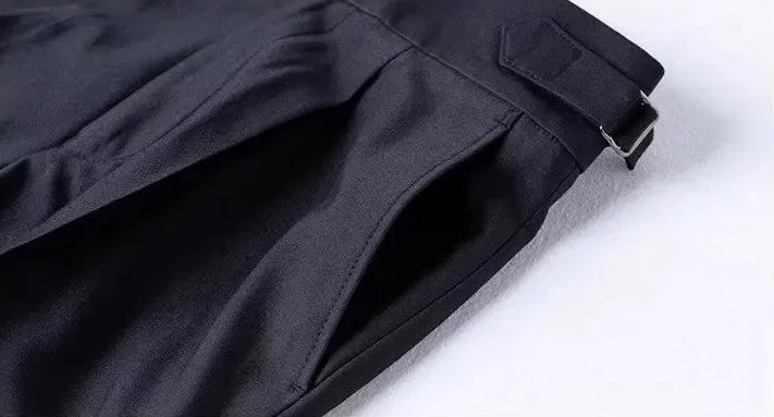 These trousers combine modern elegance with a tailored fit, offering a versatile option for both formal and semi-formal occasions. The mid-high waist and double-button overlap add sophistication, while the adjustable side buckles allow for a personalized, comfortable fit.