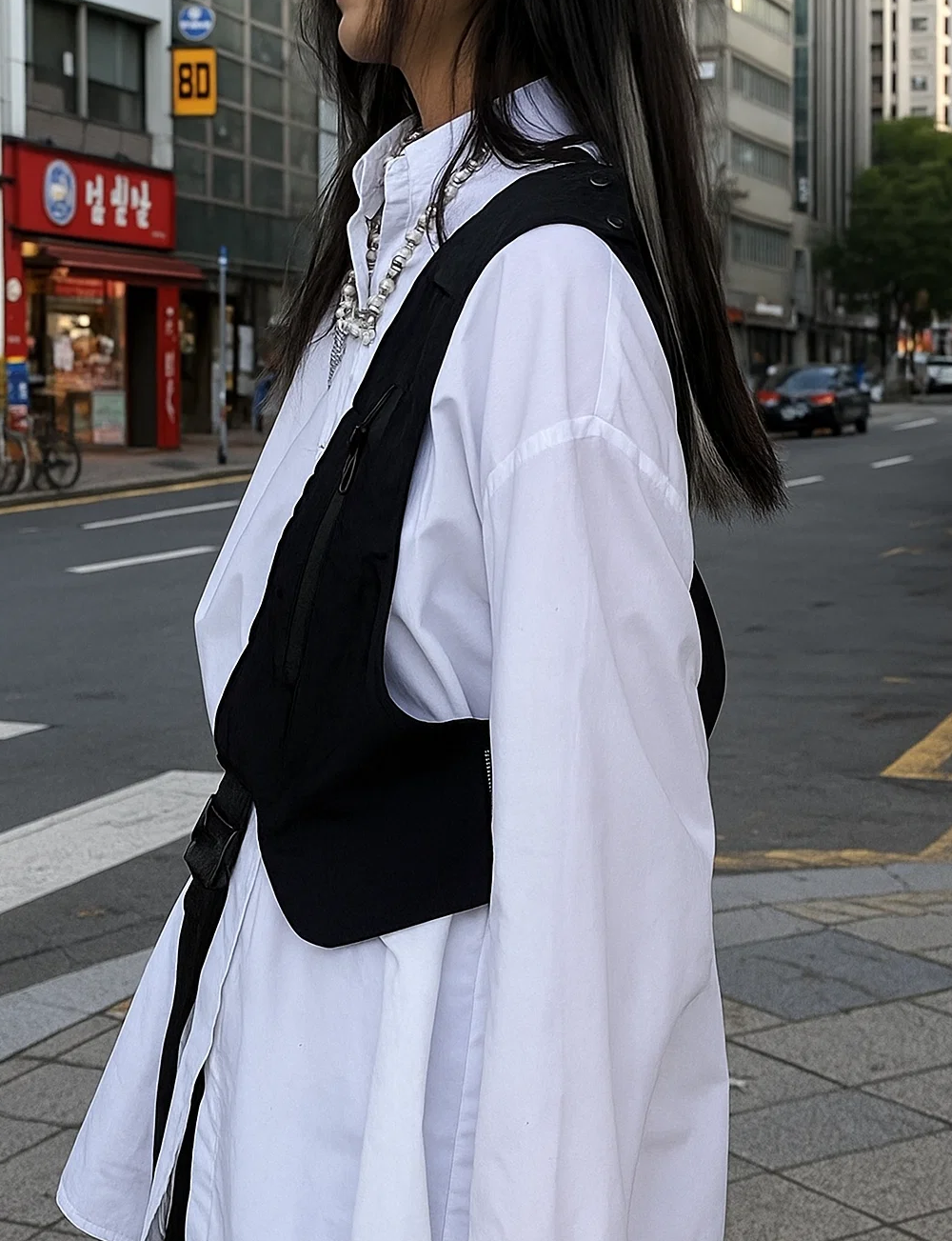 . Vest-Inspired Design — Unique half-vest silhouette with integrated storage pocket.