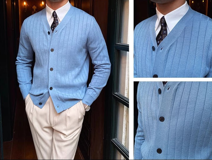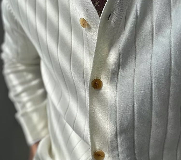 Vittorio House redefines the classic cardigan with a modern twist, featuring a refined striped design that merges traditional charm with contemporary sophistication. Crafted for those who appreciate both comfort and style, this cardigan is a versatile addition to any wardrobe.